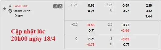 Từ đầu mùa, LASK giành được 13/26 trận thắng kèo châu Á, còn Sturm Graz có nhiều hơn 2 trận. Dù được chơi trên sân nhà, nhưng LASK chỉ có mức chấp 1/4, hoàn toàn thiếu tin cậy trong mắt giới đầu tư.