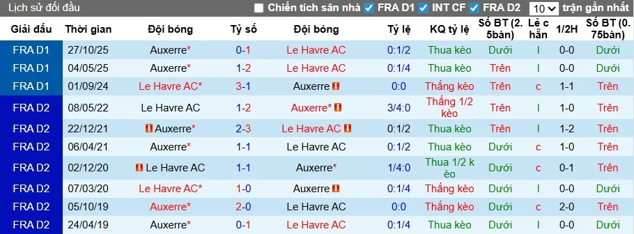 Những trận đấu có sự góp mặt của Le Havre thời gian qua thường diễn ra với thế trận rất chặt chẽ và kín kẽ, khi 4/5 trận đấu gần đây đều có không quá 2 bàn thắng được ghi. Với Auxerre, các chân sút đội khách bất lực trong việc ghi bàn ở 8/11 trận vừa qua.