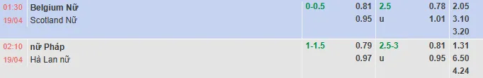 Dù xếp dưới đối thủ 1 bậc nhưng Nữ Pháp vẫn chấp -1 1/4 theo handicap ở trận đấu này. Trên sân nhà, Nữ Pháp tạo được sự tin tưởng với thành tích thắng kèo 5/6 trận gần đây. Trong khi đó Nữ Hà Lan thua kèo 4/6 trận sân khách gần nhất.