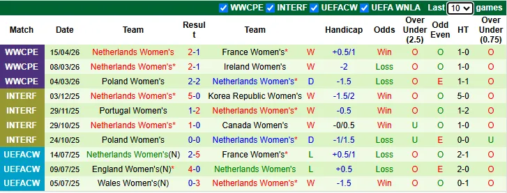 Thống kê phong độ 10 trận gần nhất của Nữ Hà Lan