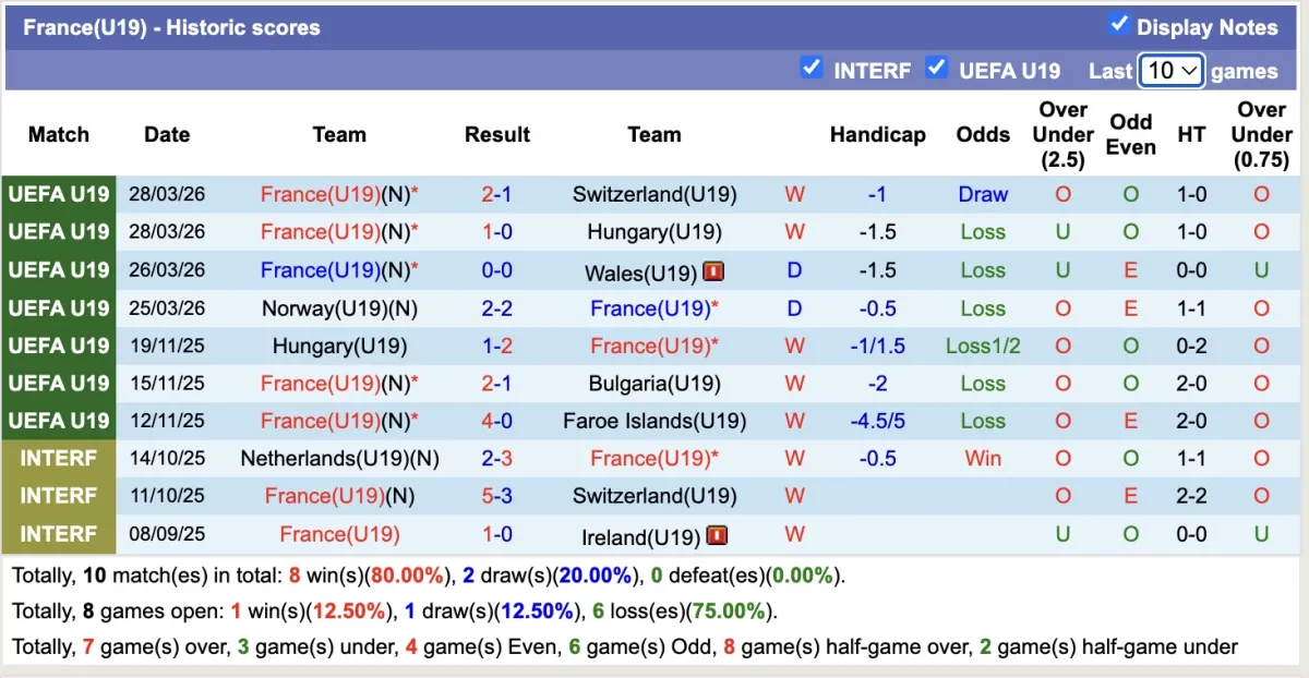 -Thống kê phong độ 10 trận đấu gần nhất của U19 Pháp