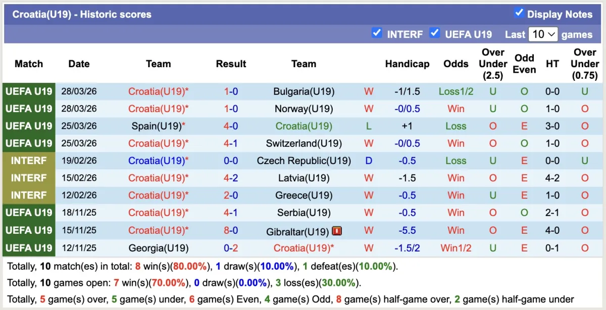 -Thống kê phong độ 10 trận đấu gần nhất của U19 Croatia