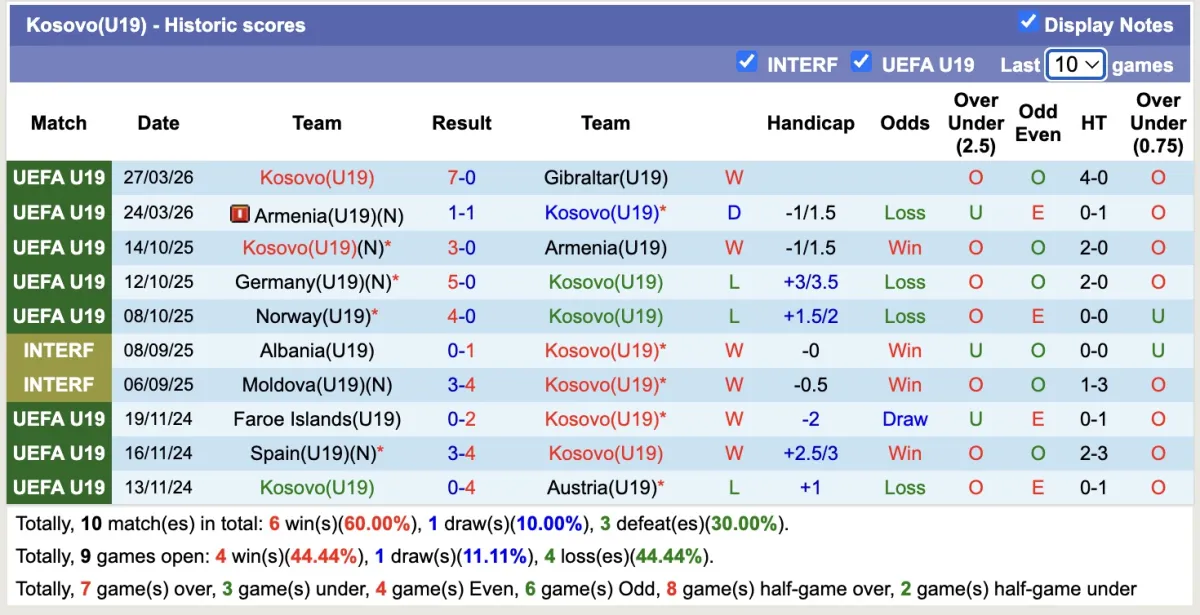 – Thống kê phong độ 10 trận đấu gần nhất của U19 Kosovo.