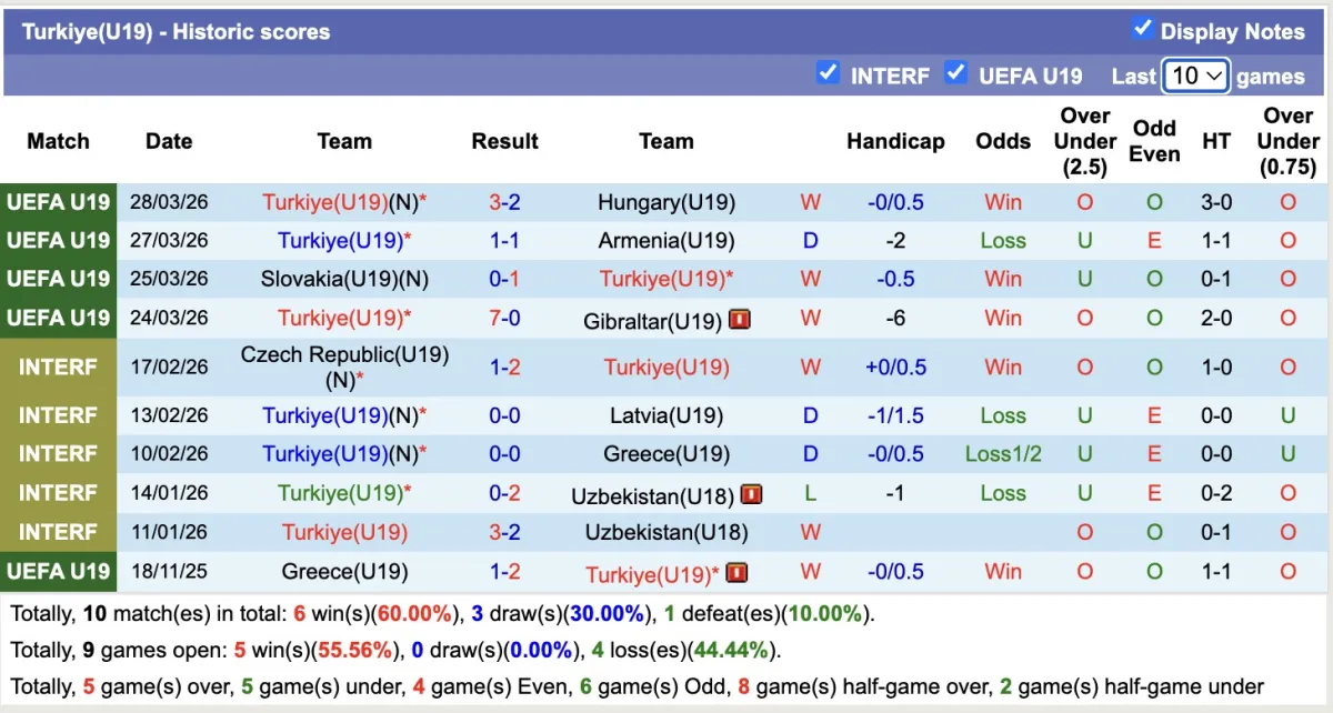 – Thống kê phong độ 10 trận đấu gần nhất của U19 Thổ Nhĩ Kỳ.