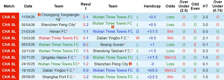 – Thống kê kết quả 10 trận gần nhất của Wuhan Three Towns